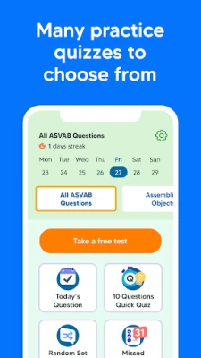 Additionally, our mobile app provides a personalized study plan based on your skill level, study frequency, and target test date. Not sure when you want to take the exam? You can adjust your study plan as often as you like. Our proprietary readiness score will help you determine when you’re ready to take the real Armed Services Vocational Aptitude Battery exam and pass with a high score on your first try.