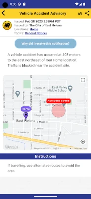 The Voyent Alert! communications are customized for each user’s followed locations (e.g. "Home", "Work", "Kid's School", "Mobile Phone"). Users can be provided with notifications containing greater situational context, such as direction and distance to a critical event based on their location as well as enriched media such as images, PDFs and hyperlinks to more information.